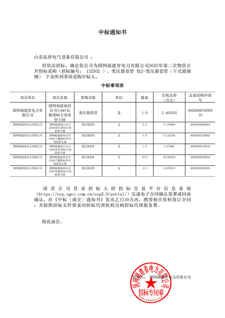 2025.02.14 110kV瓷絕緣穿墻套管中標通知書